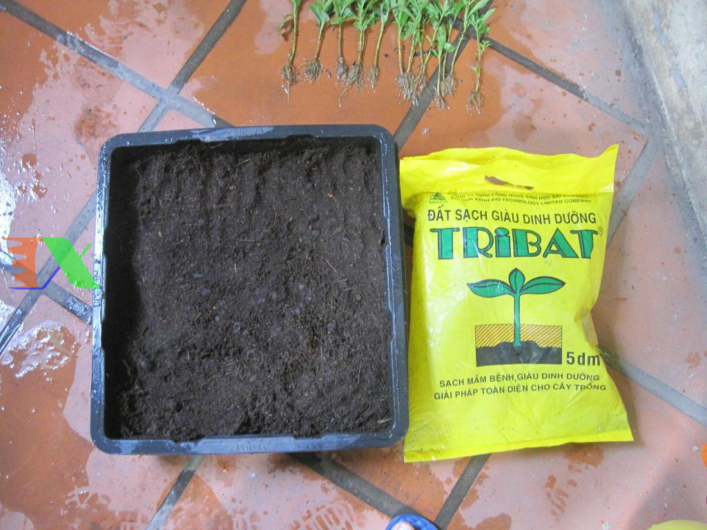 Đổ đất  Tribat  trồng mầm vào dụng cụ trồng ( rổ nhựa, khay nhựa, thùng xốp) có độ dầy khoảng 1 - 1,5cm