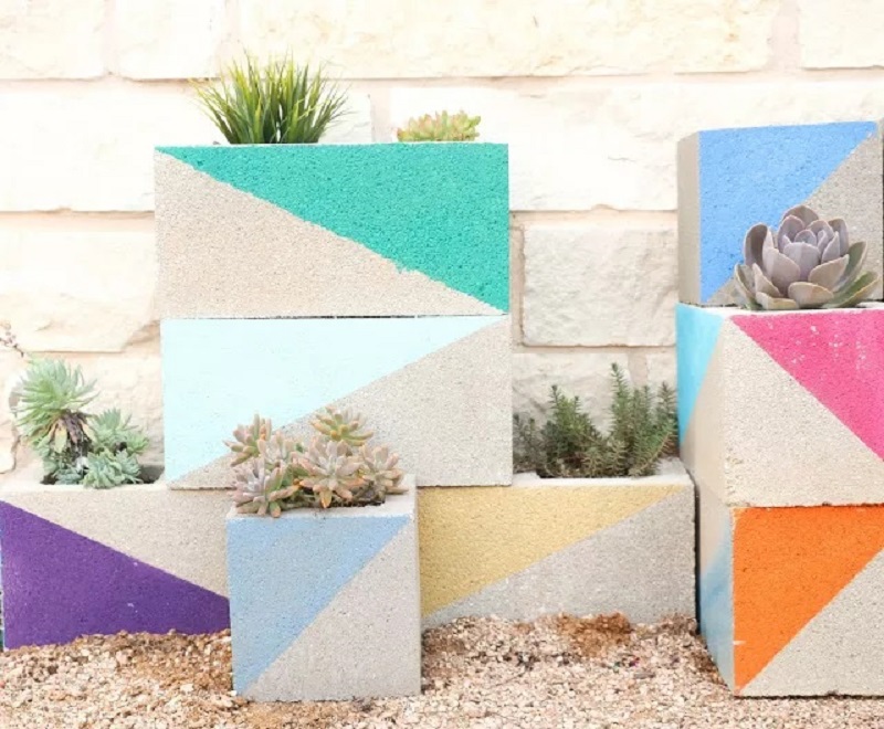 Tái tạo lại các khối chất kết dính đang nằm xung quanh nhà kho của bạn bằng cách sơn chúng bằng các hình dạng hình học ngộ nghĩnh, sau đó xếp chúng lên nhau để tạo ra một khu vườn trồng đầy màu sắc, hoàn hảo để trồng nhiều loại cây khác nhau.