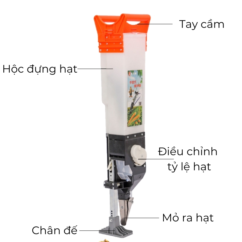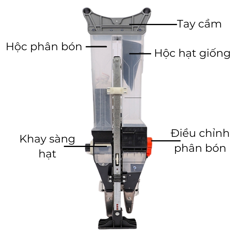 • Thiết kế tích hợp: Máy có hai đầu ra ("2 đầu ra") và hai hộc chứa riêng biệt, một cho hạt giống và một cho phân bón.8 Hộc chứa hạt thường được làm trong suốt giúp người dùng dễ dàng quan sát lượng hạt còn lại.