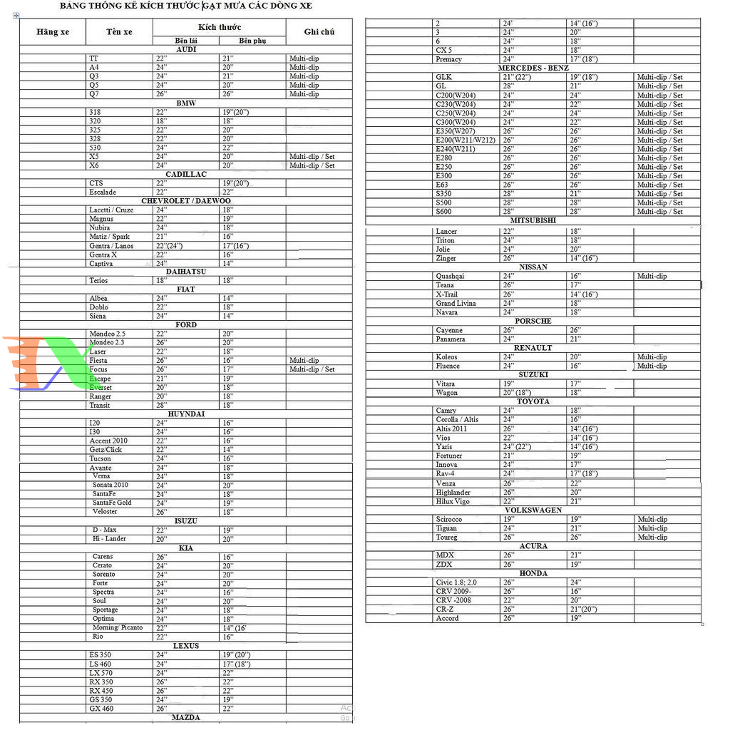 Sản phẩm được sản xuất theo kích thước chuẩn ,dễ dàng thay thế, lắp đặt theo bảng kích thước các loại xe ở dưới.
