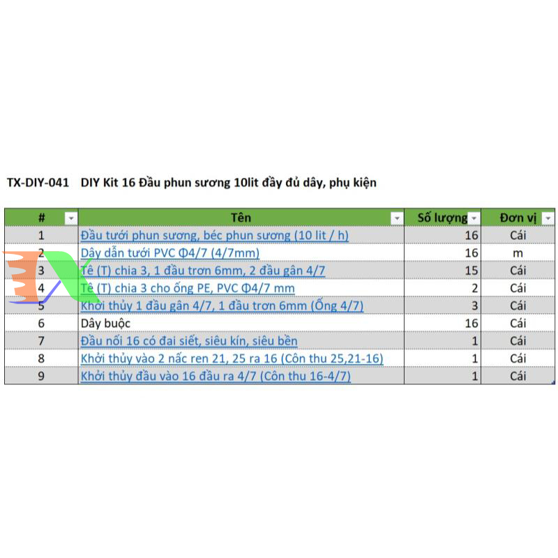 DIY Bộ Kit 16 Đầu phun sương 10lit đầy đủ dây, phụ kiện (TX-DIY-041) là sản phẩm hoàn hảo. Là bộ kit tưới gia đình, bộ tưới tự động cho gia đình, bộ kit tưới cho trẻ em, bộ kit tưới làm mát Sản phẩm được thiết kế cho các hệ thống tưới gia đình, tưới làm mát, tưới giữ ẩm, tưới tự động, sản phẩm này khi kết hợp với van hẹn giờ điện tử bạn dã tự xây dựng cho mình một hệ thống tự động hoàn toàn. Nếu kết hợp với ổ cắm hẹn giờ wifi thì sản phẩm sẽ là một mô hình IOT hoàn hảo.