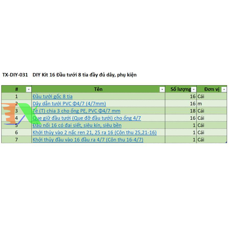 DIY Kit 16 Que cắm tưới xoay đầy đủ dây, phụ kiện (TX-DIY-01). Kit tưới đầy đủ các phụ kiện đi kèm giúp cho các bạn yêu thích trồng rau, hoa dễ dàng lắp đặt. Hệ thống tưới phù hợp với các mô hình vườn gia đình nhỏ, vườn sân thượng, vườn ban công