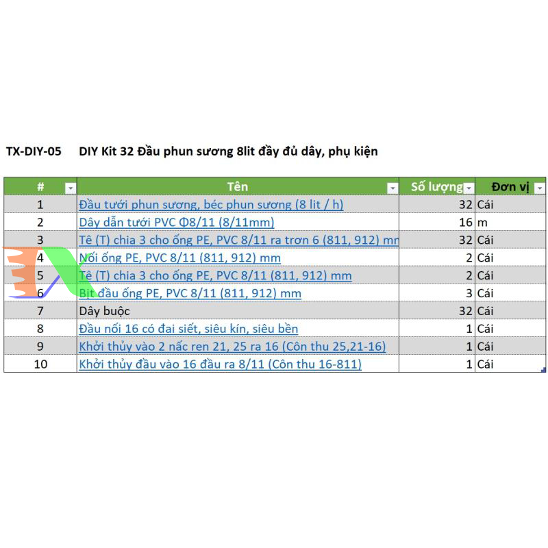 DIY Kit 16 Que cắm tưới xoay đầy đủ dây, phụ kiện (TX-DIY-01). Kit tưới đầy đủ các phụ kiện đi kèm giúp cho các bạn yêu thích trồng rau, hoa dễ dàng lắp đặt. Hệ thống tưới phù hợp với các mô hình vườn gia đình nhỏ, vườn sân thượng, vườn ban công