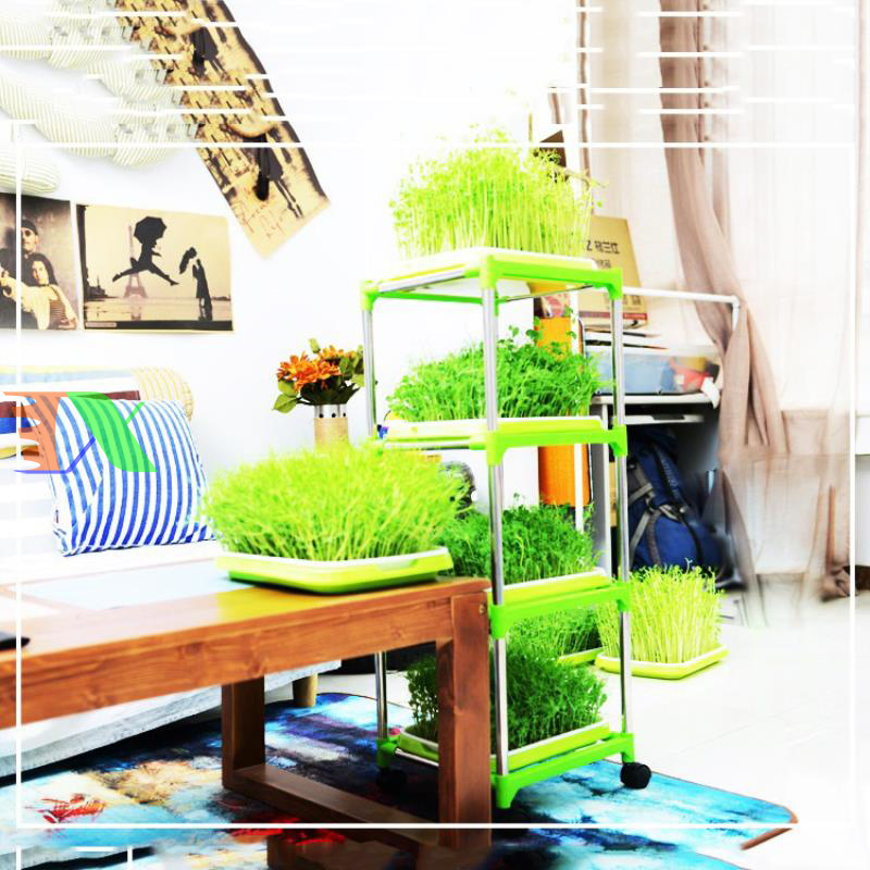 Bộ sản phẩm gồm : Giá đỡ có 4 bánh + Khay + Hạt giống + Vòi xịt nước.