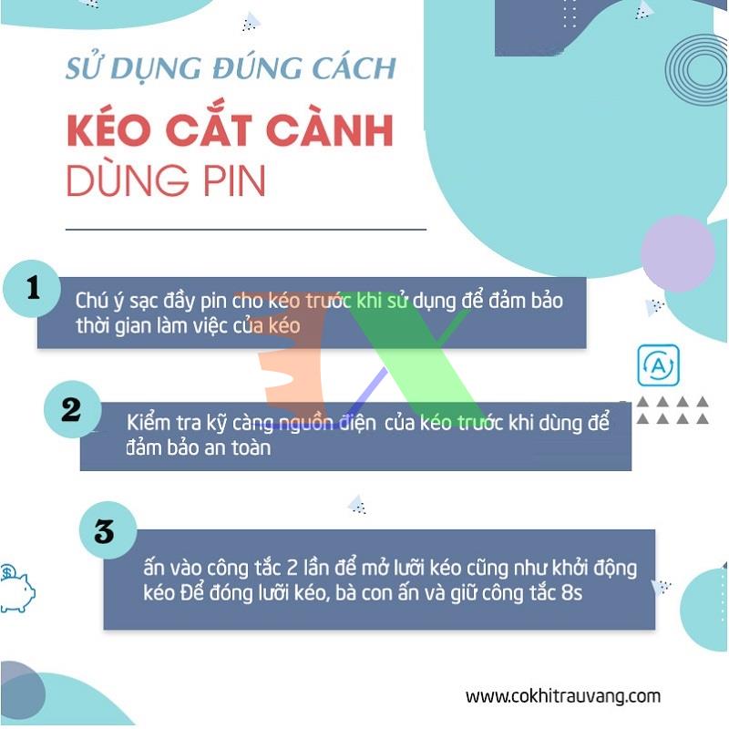Với dòng kéo sử dụng pin thì thời gian hoạt động của kéo khi dùng liên tục là 2-3 tiếng và cách sử dụng kéo cũng gần tương tự với dòng kéo không sử dụng pin. Mọi người chỉ cần chú ý một số điểm như sau của kéo: