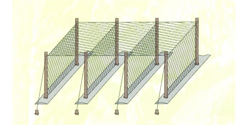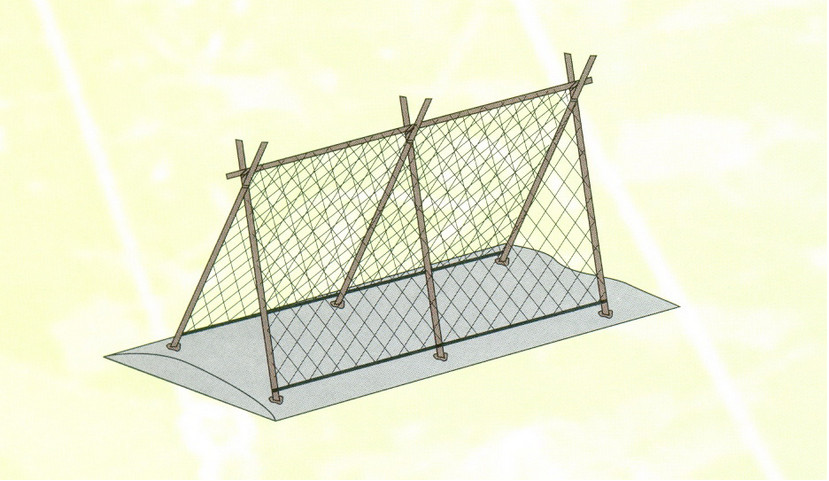 B4: Kéo căng dây luồn biên trên và dưới, buộc cố định vào khung giàn; dây chằng liên kết giàn ( các mối cột cách nhau khoảng 0,5m). Buộc cố định các mép lưới vào khung sườn của giàn.