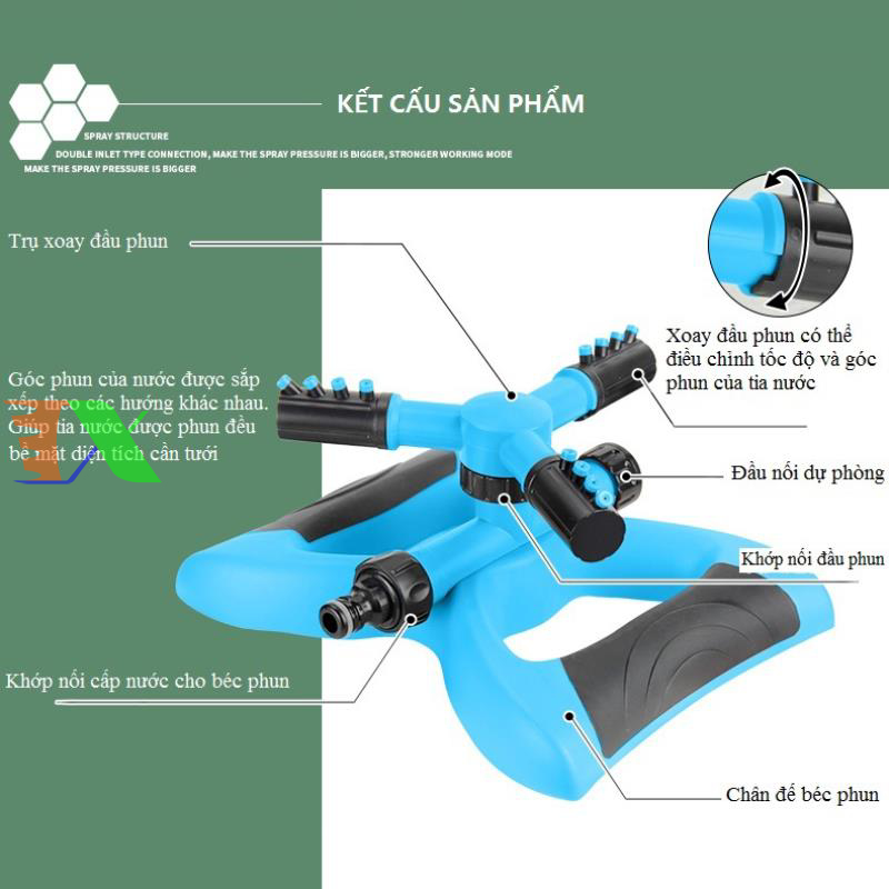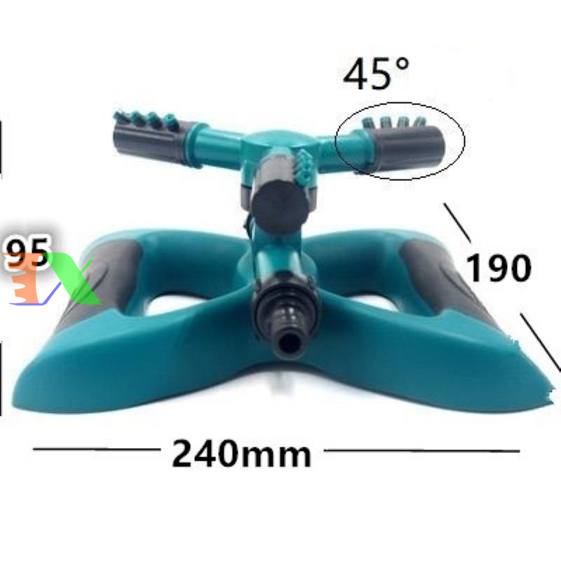 - Đầu tưới nước tự động 3 cánh xoay 360° được thiết kế với trục cánh tay quay bằng tưới nước kép số 3 cánh và xoay 360° giúp việc chăm sóc cây vườn, làm mát sân, mát mái được thuận tiện, nhanh chóng và tiết kiệm nước