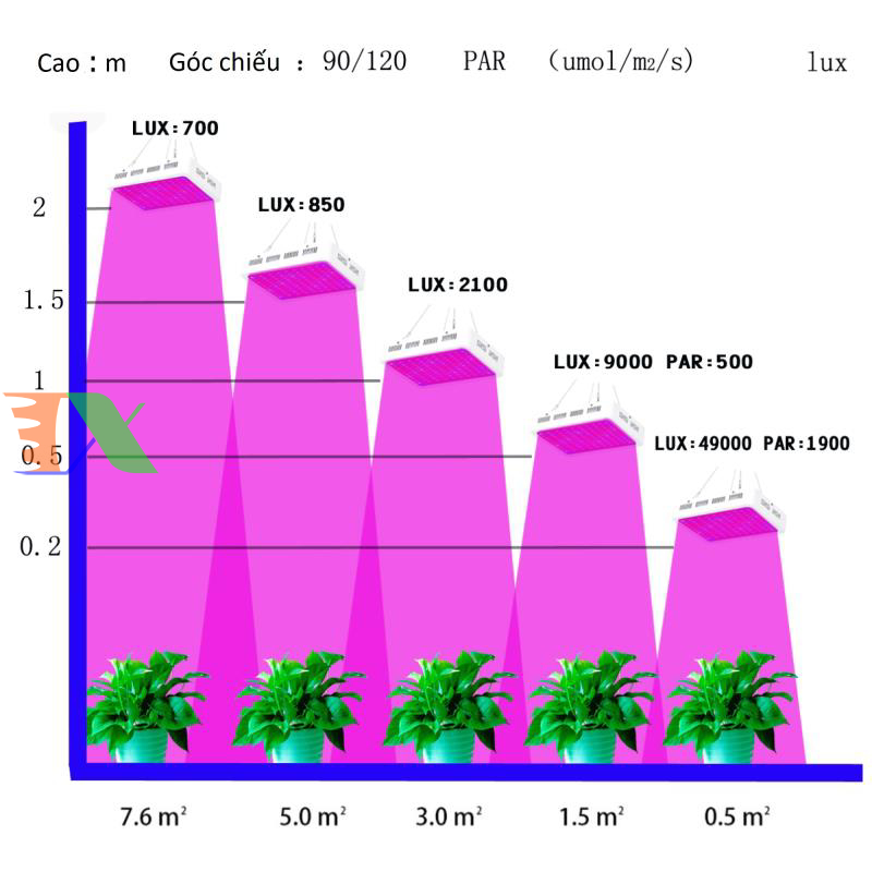 - Đối với xà lách, Cải các loại cây ôn đới : 70-90w / 1m2 (Công suất tiêu thụ điện)