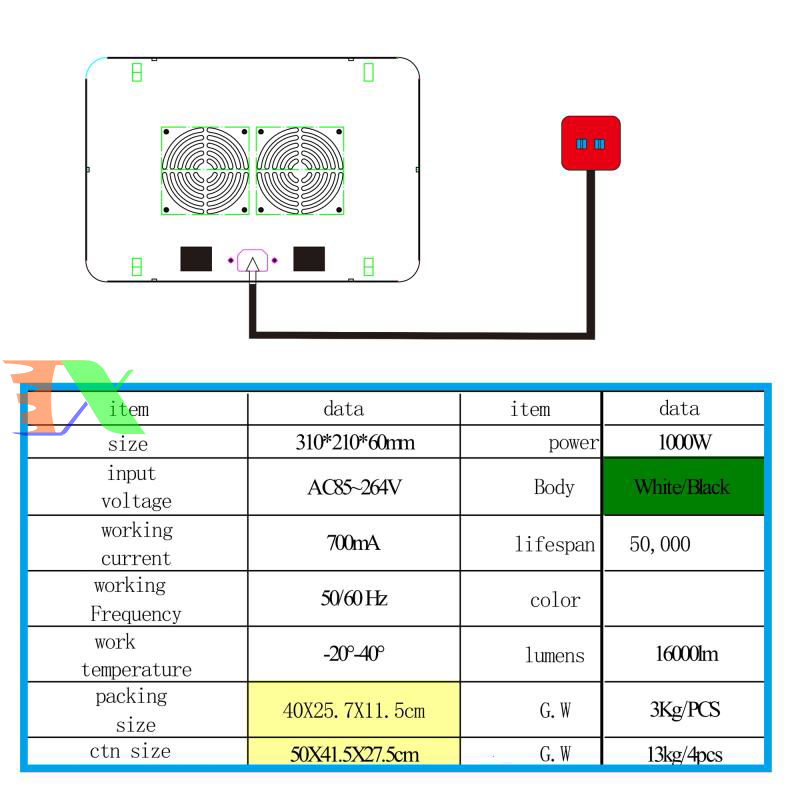 Công suất Công suất Led : 1'000W (10W x 100 led) / Công suất tiêu thụ điện 350W