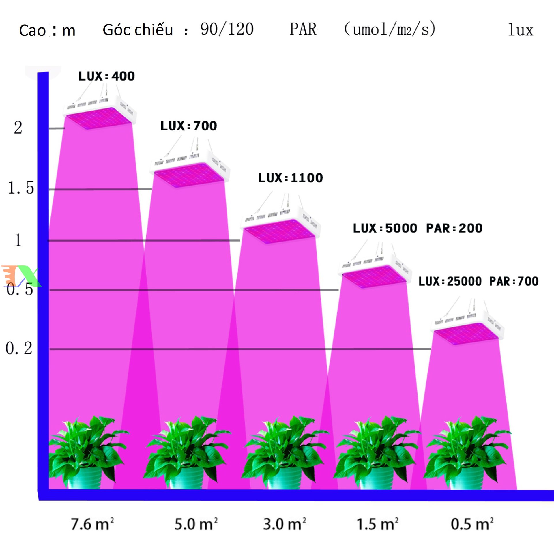 - Đối với xà lách, Cải các loại cây ôn đới : 70-90w / 1m2 (Công suất tiêu thụ điện)