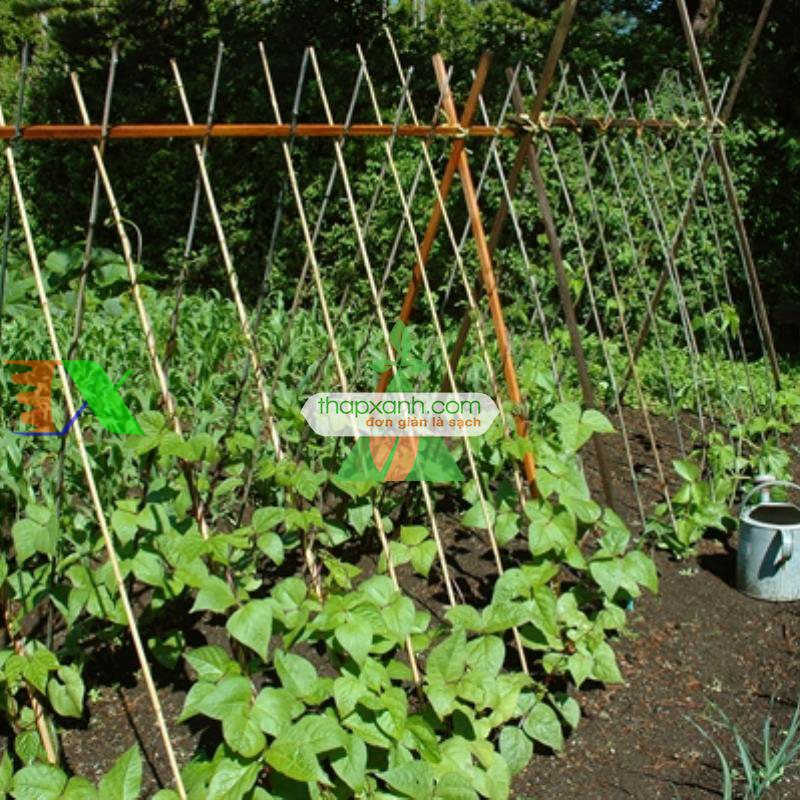 Mỗi cây cắm 1 cọc cao 1.5m cách gốc 10cm. Có thể buộc thêm các thanh ngang nối các cọc với nhau tạo giàn chắc hơn.