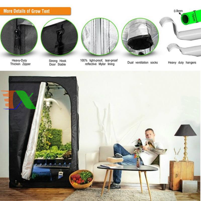 Toàn hệ thống nặng chắc chắn. Mặt trong lều là tấm phản quang, phù hợp với lắp đèn led trồng cây (đèn trồng cây), phù hợp với trồng thủy canh, trồng đất.
