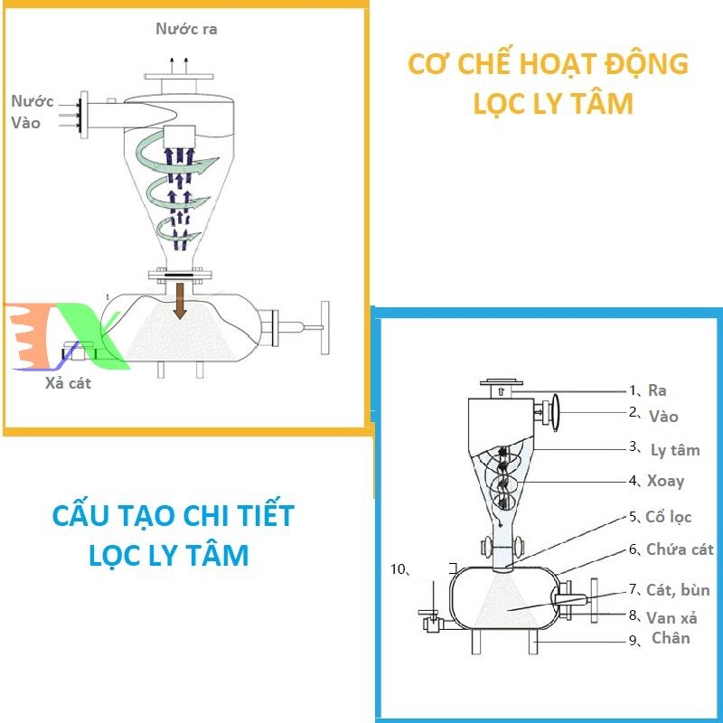 Lọc ly tâm hoạt động dựa trên nguyên lý tách vật chất theo lực ly tâm. Khi dòng nước chứa tạp chất đi vào buồng lọc, lực quay mạnh bên trong sẽ khiến các hạt cát, sỏi, bùn – vốn có khối lượng riêng nặng hơn nước – bị văng ra ngoài thành lọc, theo hình xoắn ốc rồi rơi xuống đáy nhờ thiết kế hình phễu. Phần nước sạch sau khi tách cặn sẽ được đưa lên đỉnh quả lọc và thoát ra ngoài, tiếp tục đi vào lọc tinh (lọc lưới, lọc màng) hoặc được sử dụng trực tiếp nếu đã đạt yêu cầu.