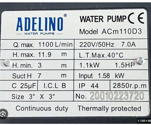 Đây là dòng máy bơm điện 1.5HP, hoạt động ở 220V/50Hz với các thông số như sau: