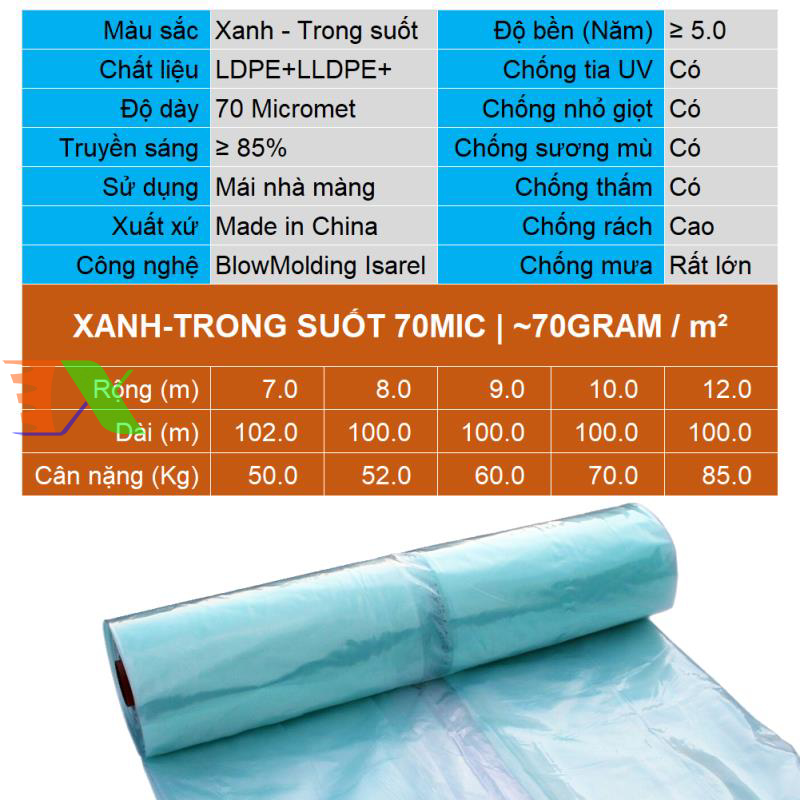- Màng màu xanh tuy mỏng hơn nhưng vì nó chất lượng cao, độ bền hơn 5 năm nên lợi thế chi phí thấp, nhẹ, giá thành tốt hơn, cản tia UV là điều hầu hết các màng phủ trên thị trường không có, độ đàn hồi và độ dai cao, chống rách, nên khuyến khích lựa chọn, màng đều được sản xuất theo công nghệ : Blow molding (Thổi đúc) của isarel, nhựa nguyên sinh