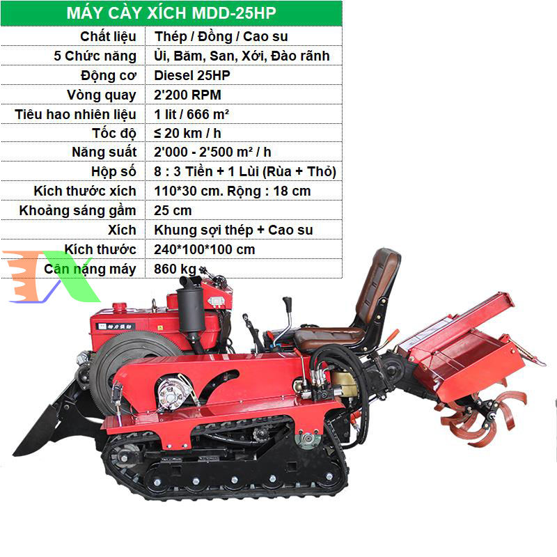 2. Đa năng và linh hoạt: Máy cày 25hp được trang bị bánh xích và bản xích rộng 25cm, với thân máy rộng 90cm và dài 240cm. Điều này cho phép máy vận hành một cách mượt mà và linh hoạt trên mọi loại địa hình. Bên cạnh đó, với 5 chức năng làm việc như san lấp, ủi, phay đất, xới đất và đào rãnh, máy cày 25hp sẽ trở thành đồng minh đáng tin cậy cho mọi công việc nông nghiệp của bạn.