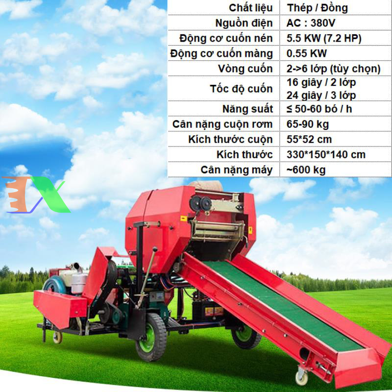 Quy cách Động cơ 5.5 KW - 7.2 HP Lõi đồng, Băng tải, Buồng cuốn cỏ, Máy cuốn màng | Bó cỏ : 65-90 kg