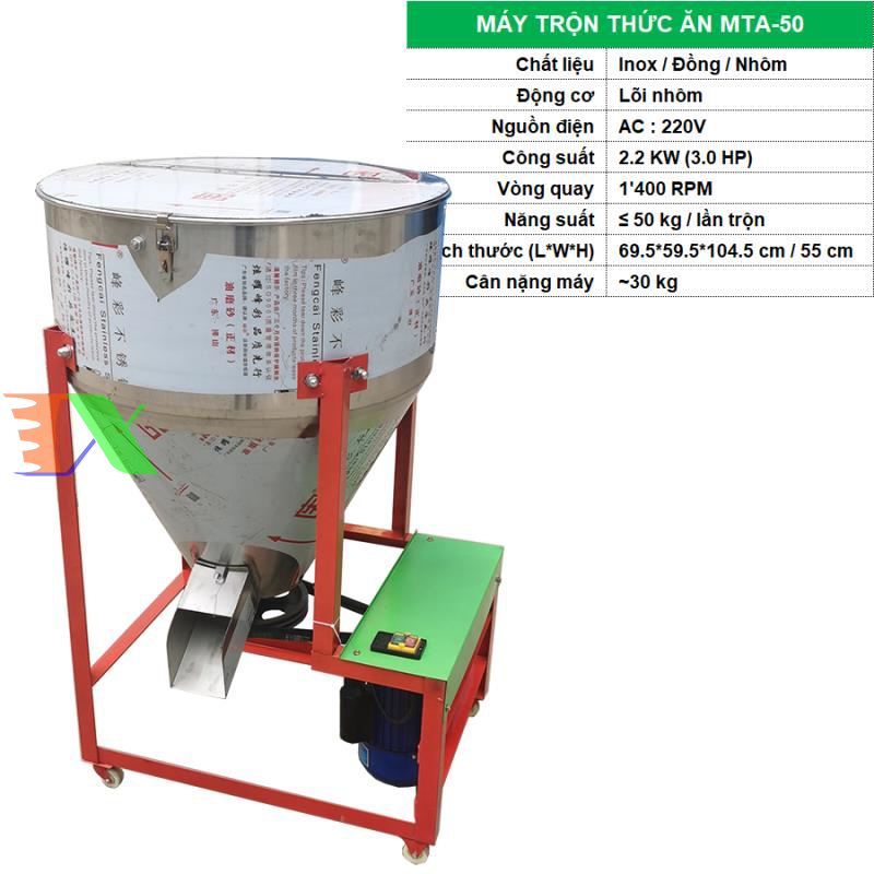Máy trộn thức ăn MTA-50 là thiết bị phối trộn thức ăn chăn nuôi đa năng công suất lớn. Máy có khả năng trộn các loại bột khô, bột ướt, cám, dung dịch lỏng… cho thành phẩm có chất lượng đồng đều. Thiết bị được sử dụng rộng rãi trong các hoạt động nông nghiệp, chăn nuôi, sản xuất và chế biến đa dạng các loại sản phẩm phục vụ đời sống.