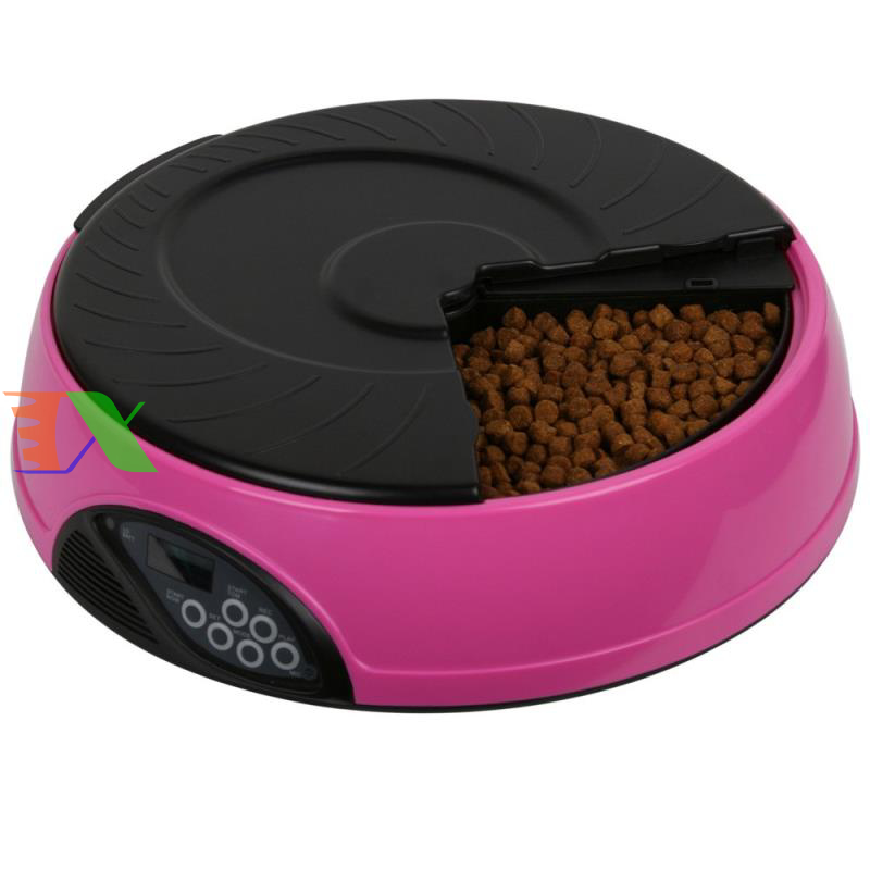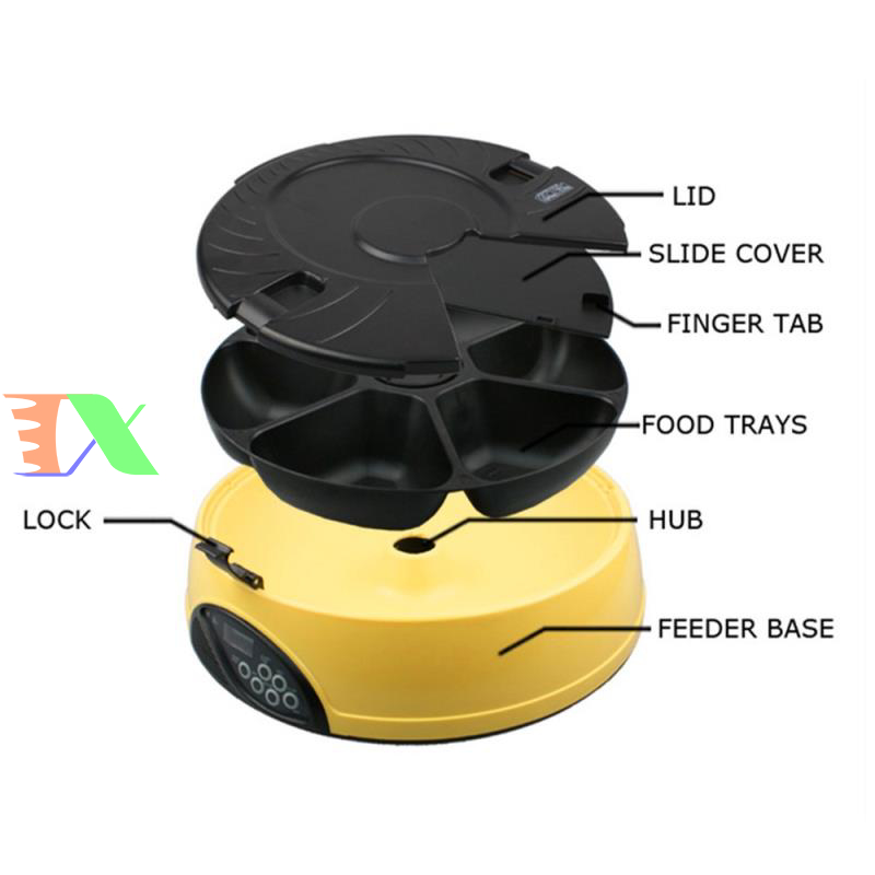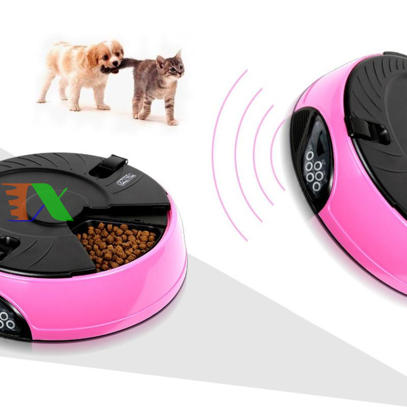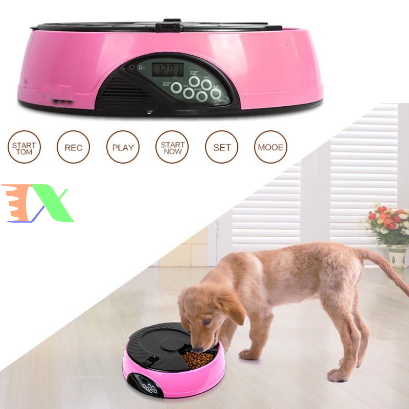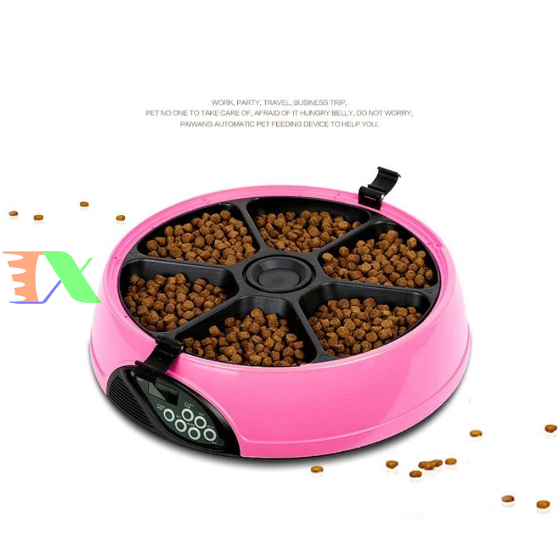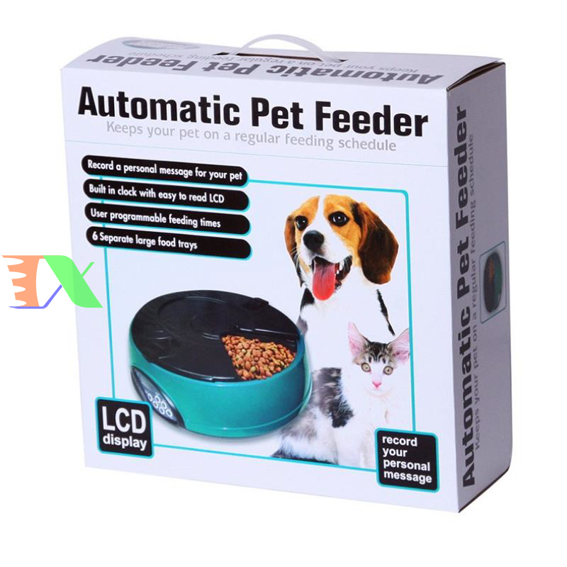 Máy tự động cho chó ăn, máy tự động cho mèo ăn. Máy hẹn giờ cho chó ăn 6 ngăn, máy hẹn giờ cho mèo ăn là Sản phẩm được làm từ nhựa cao cấp, dẻo có đồ bền cao, an toàn cho pet (chó mèo), riêng máng ăn làm từ vật liệu ABS có độ bền cao. Bình đựng thức ăn được làm từ nhựa PP, nắp bình là ABS. Sản phẩm thích hợp cho chó mèo các kích cỡ từ trung & nhỏ đến lớn.