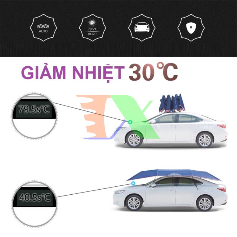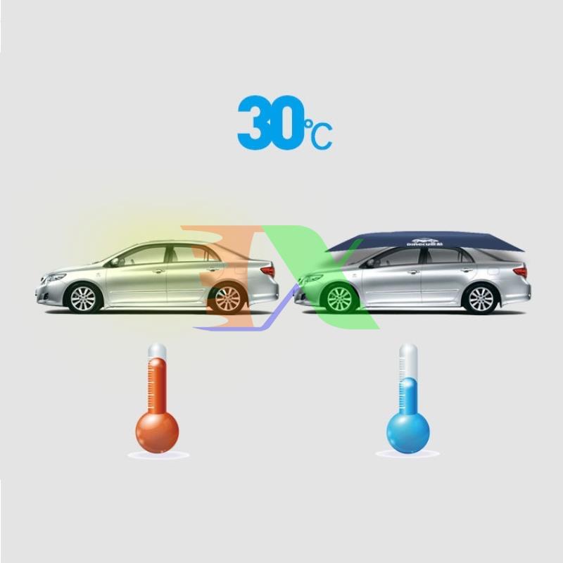 - Tấm vải bạt che nắng: Được làm từ chất liệu được phủ lớp PU chống nước, chống thấm, khó rách, sức chịu nước lớn đến 800mmW/R nên có thể chống cả nắng và mưa chuyên nghiệp. Đặc biệt, chất liệu vải này có khả năng chống tia tử ngoại…Các lỗ thông hơi được thiết kế trên bề mặt vải bạt giúp không khí lưu thông dễ dàng, giúp giảm nhiệt cho xe mà không hề bị bí hơi.