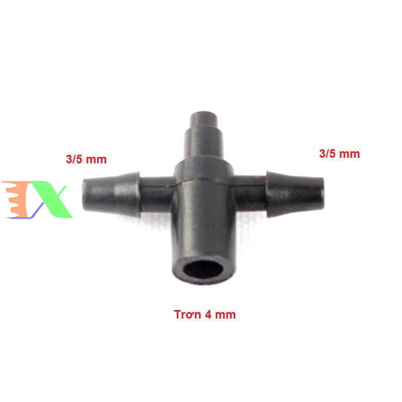 T chia 3, 1 đầu trơn 4mm, 2 đầu gân 3/5 (ống PE Φ3/5) để chia ra nhiều đầu tưới từ khởi thủy 1 đâu trơn 4mm sang dây dẫn PE 3/5. là sản phẩm không thể thiếu, là khớp nối cho hệ thống tưới, sản phẩm có độ đàn hồi cao, bền bỉ với môi trường. Chia 2 cho ống PE Φ3/5 là đầu nối lấy nước từ dây dẫn ống dây dẫn tưới Φ16 và nối vào dây tưới Φ3/5 đầu tưới nhỏ giọt, hoặc que cắm nhỏ giọt.