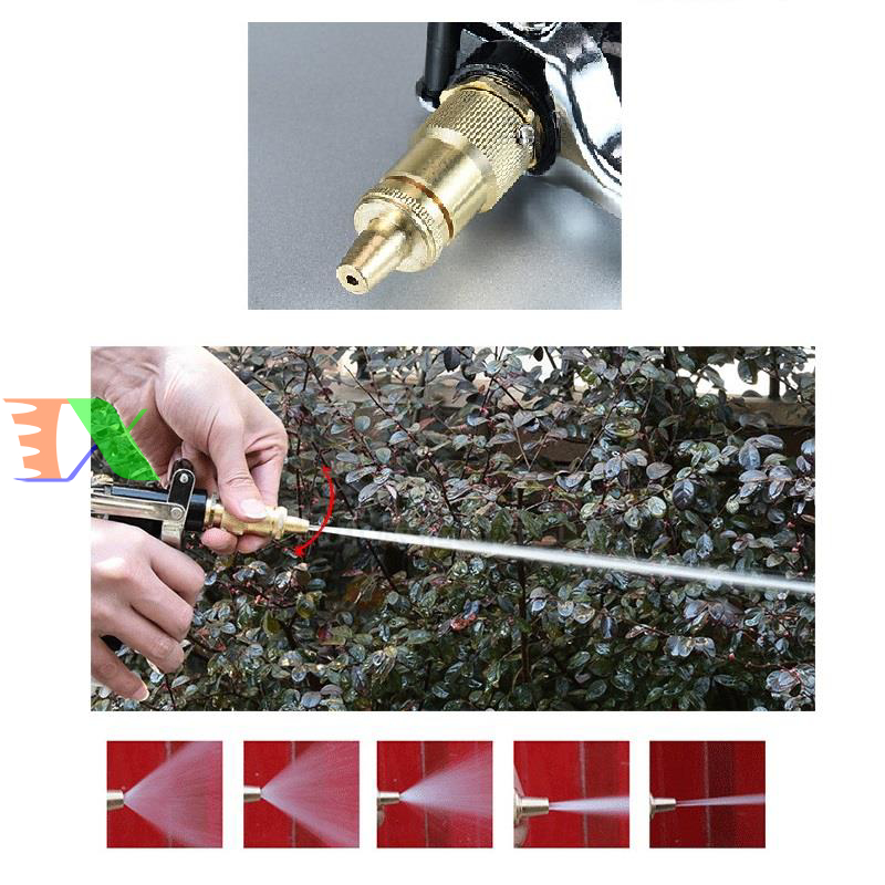 Đầu phun nước tăng áp của súng có thể phun xịt ở khoảng cách xa, lực nước càng mạnh thì xịt càng xa. Bạn có thể vặn đầu phun để chỉnh súng phun thành 1 tia nước để rửa xe hoặc tưới cây từ xa hoặc phun gần dưới dạng chùm phun xoè.